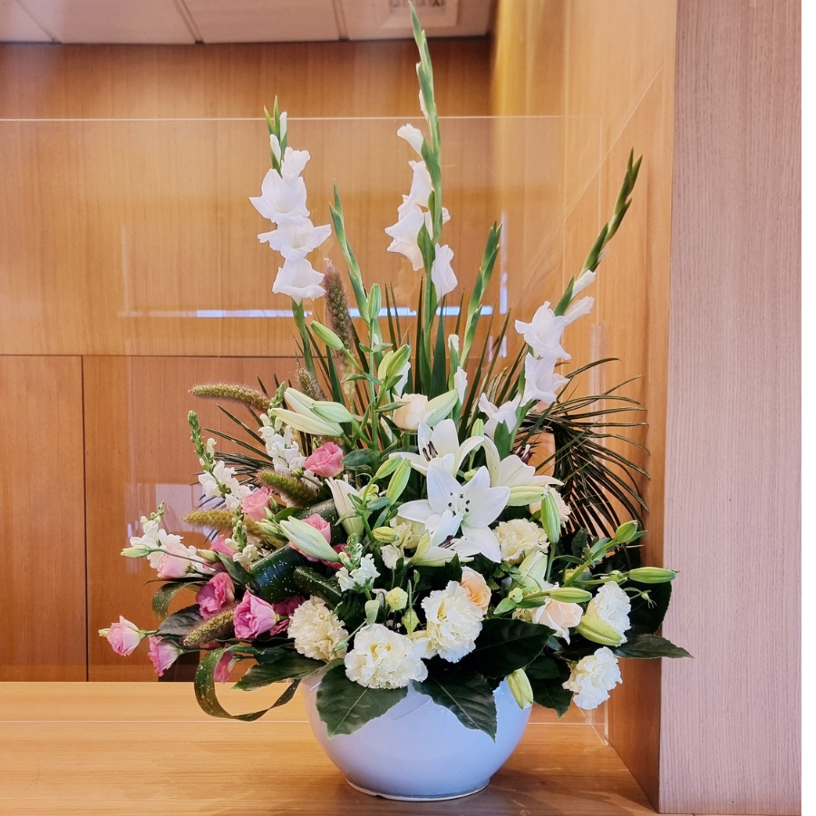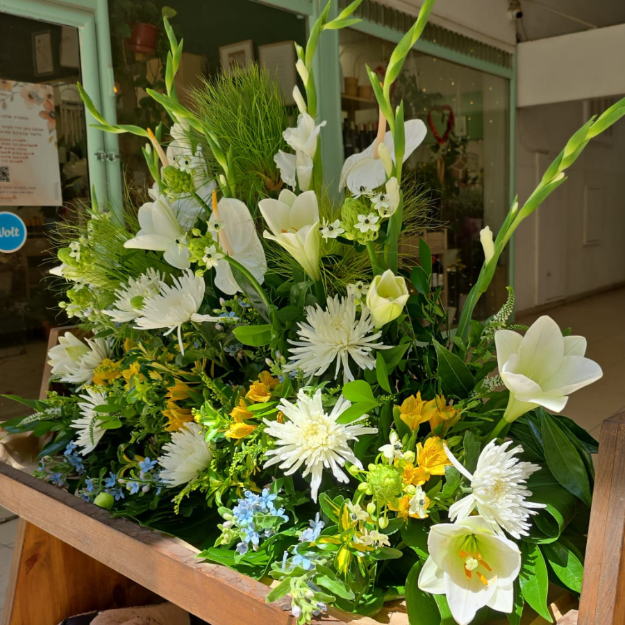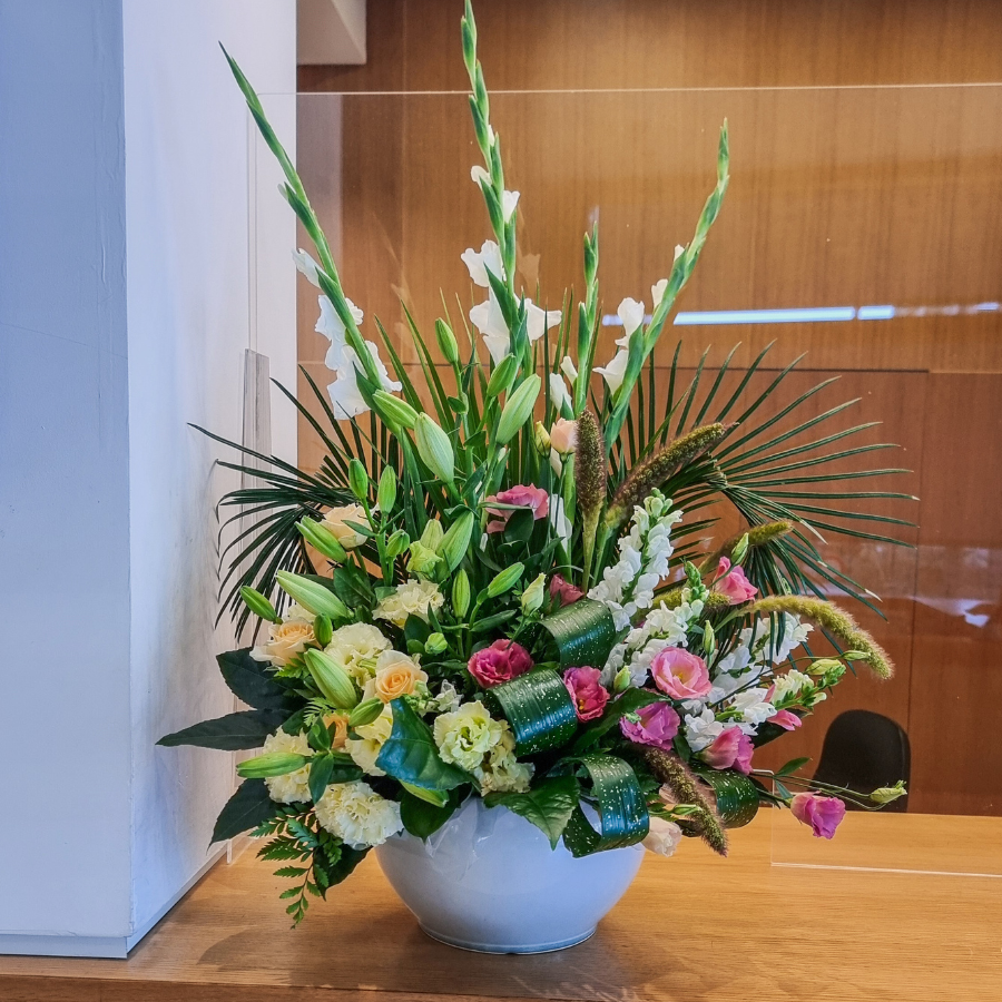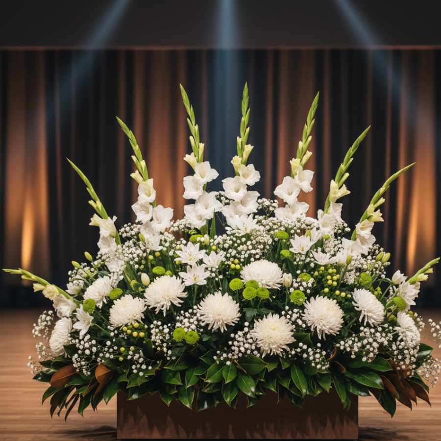 . סידור עשיר ומרשים לבמה, המשלב גלדיולות גבוהות, חרציות לבנות, ורוד בייבי ונץ חלב, בצבעוניות עדינה ויוקרתית.