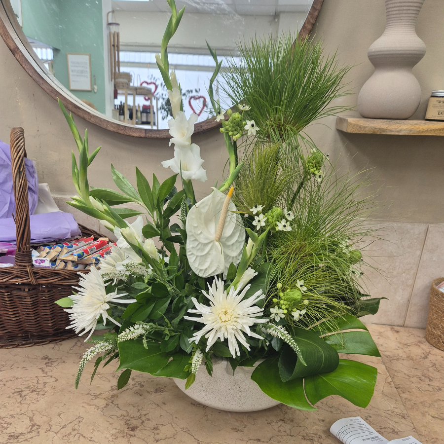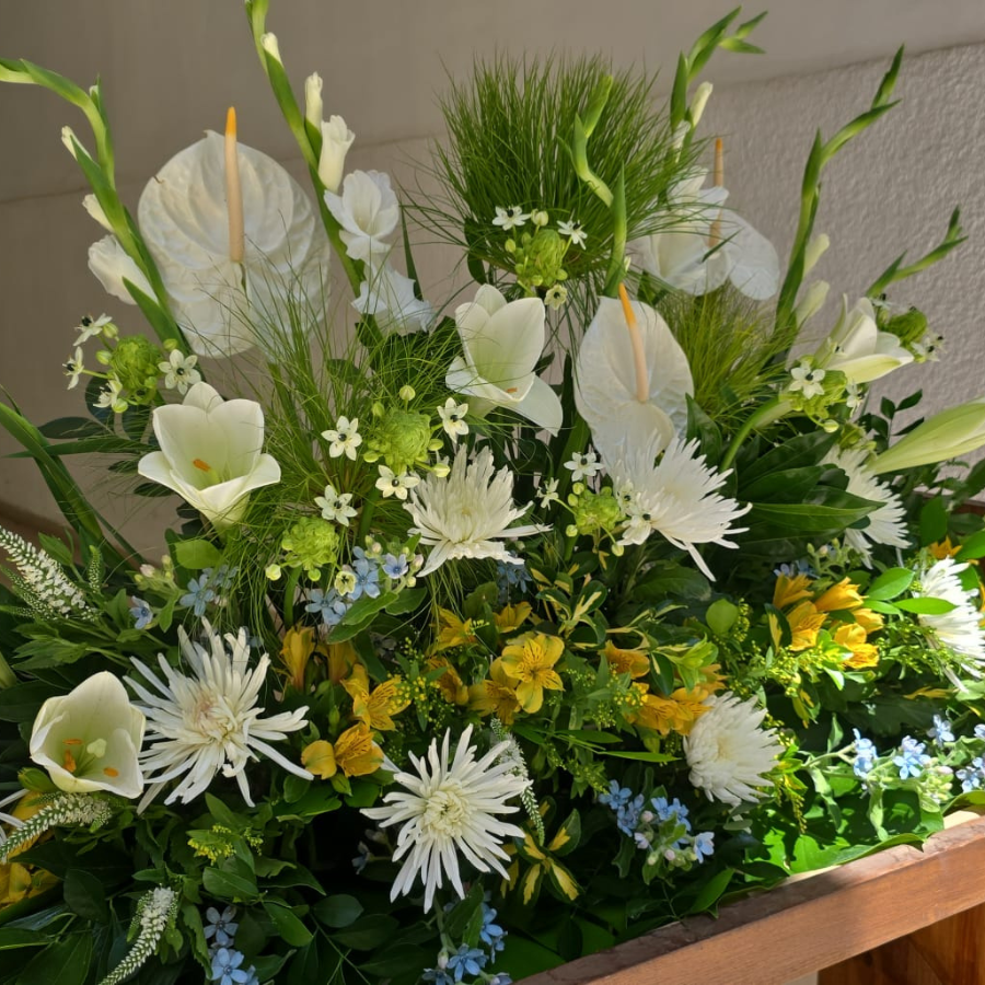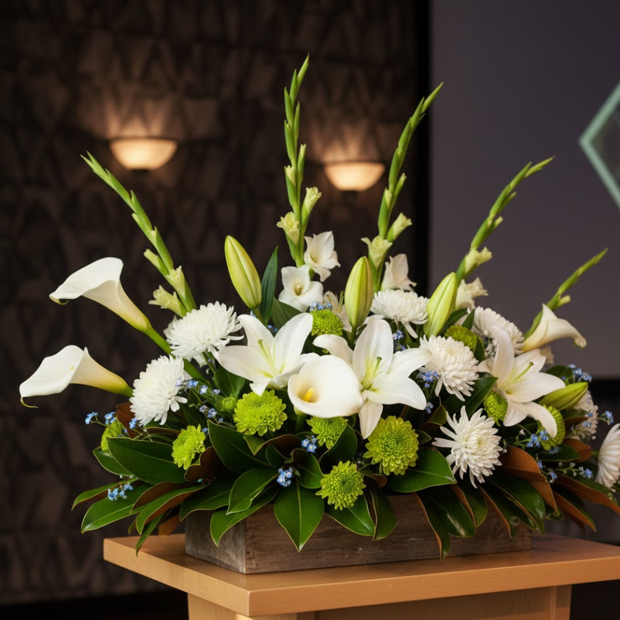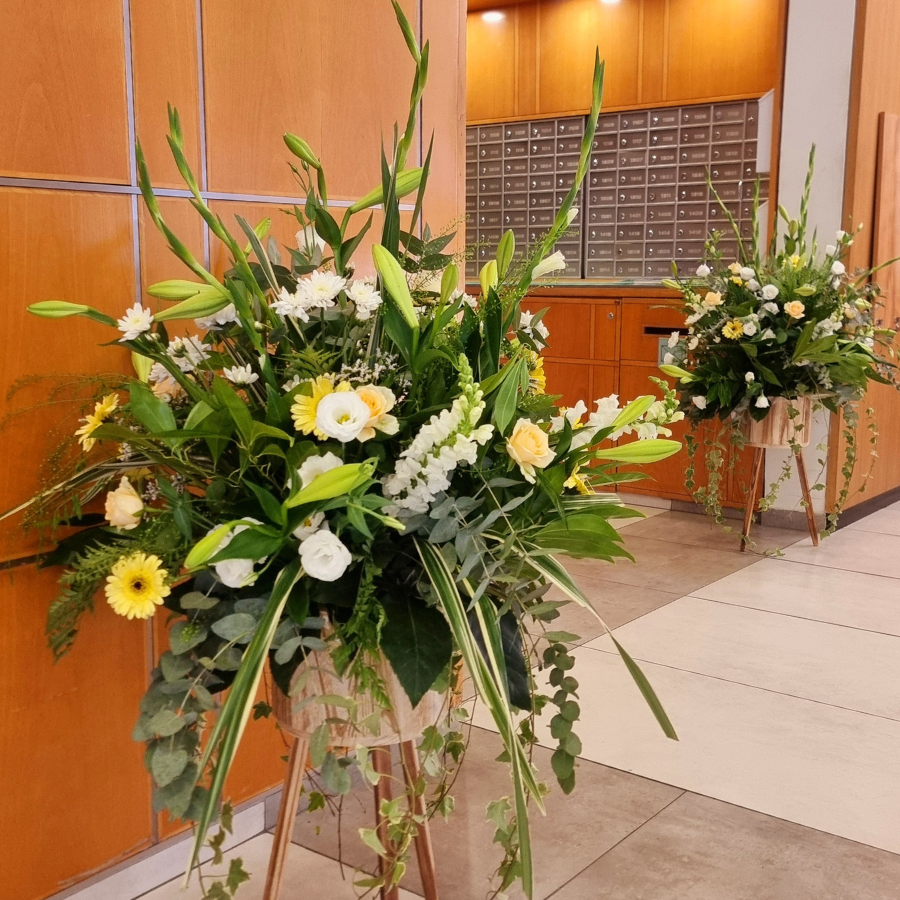 . סידור עשיר ומרשים לבמה, המשלב גלדיולות גבוהות, חרציות לבנות, ורוד בייבי ונץ חלב, בצבעוניות עדינה ויוקרתית.