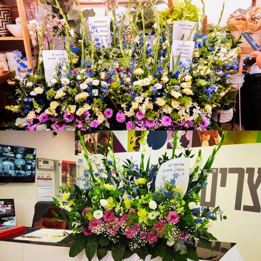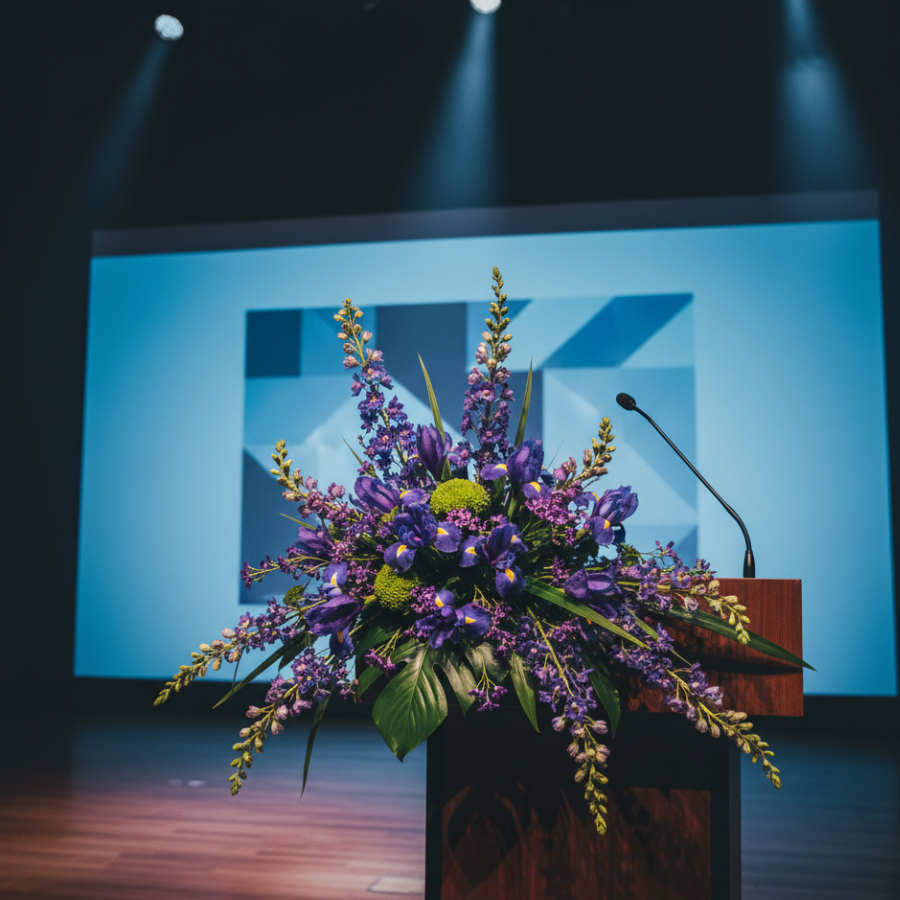 סידור פודיום בגוונים כחולים-סגולים עם אירוסים, לוע הארי ופרחי שעווה, למראה ייחודי ומודרני.