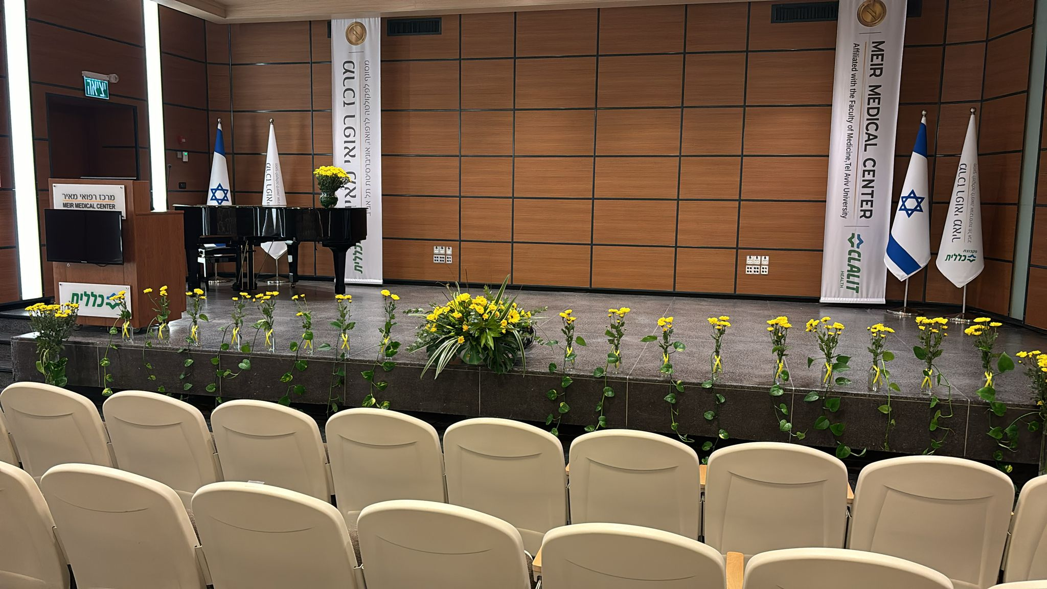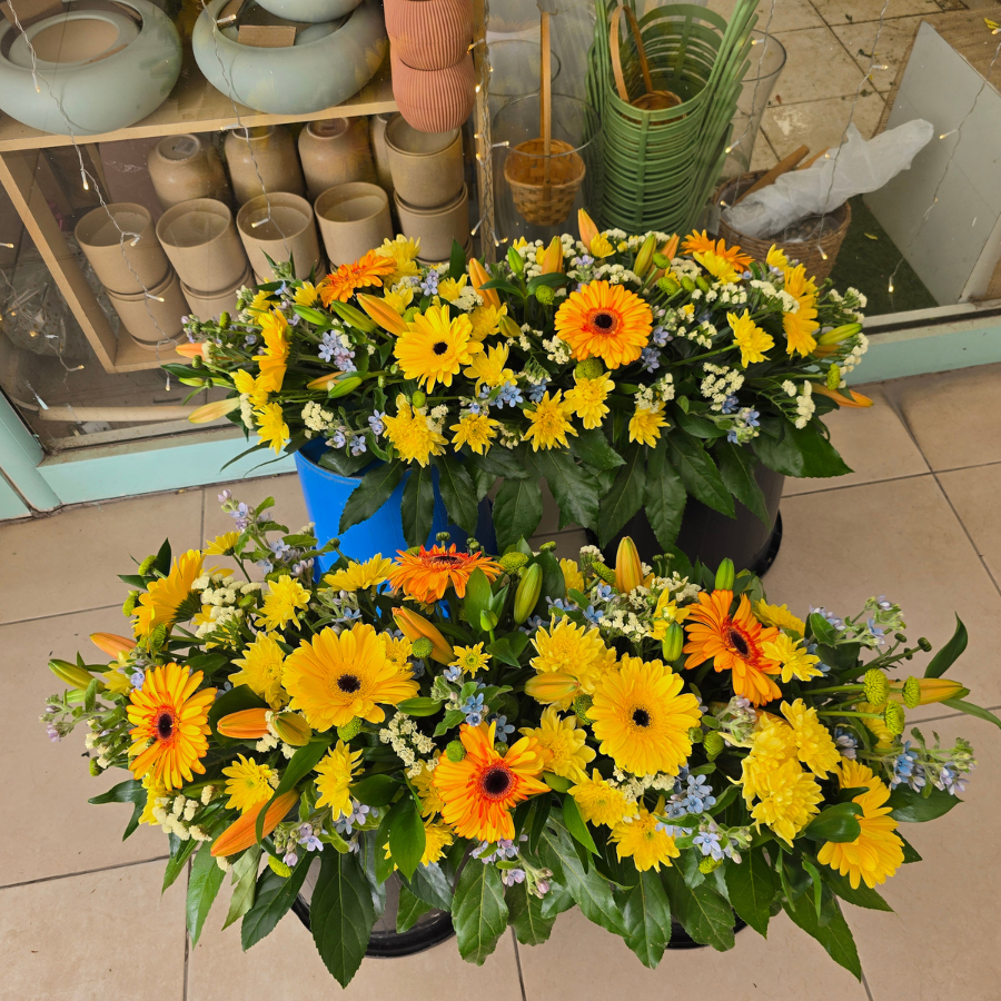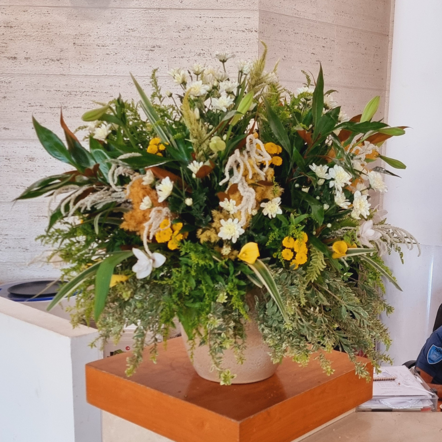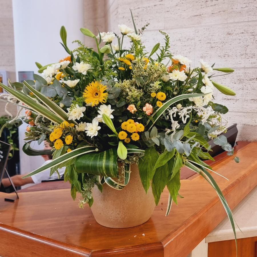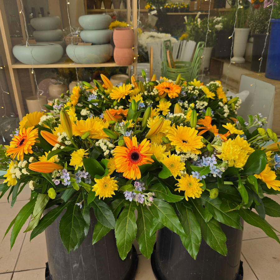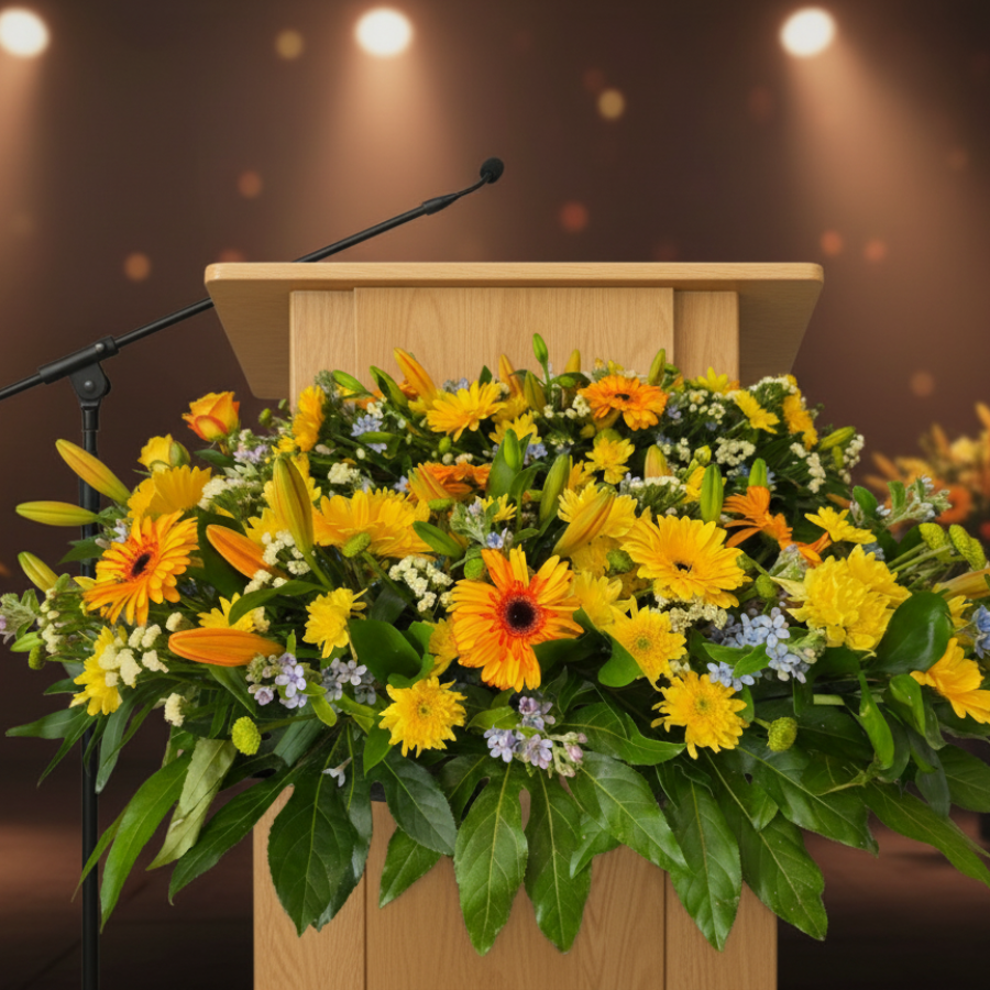 סידור פודיום ססגוני עם גרברות כתומות וצהובות, ליליות, ורדים קטנים ועלים ירוקים, שישדרג כל במה.