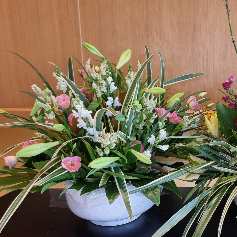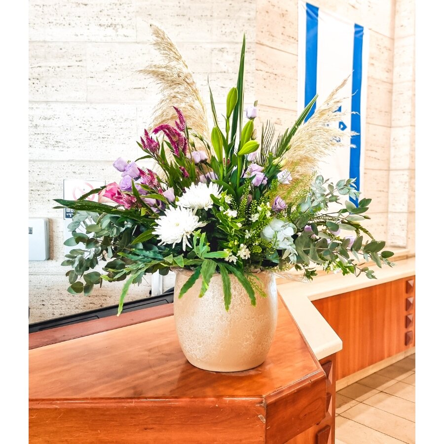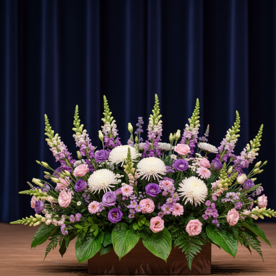 סידור במה רחב ידיים עם מגוון פרחים בגוונים סגולים, ורודים ולבנים, כמו לוע הארי, חרציות וליזיאנטוס, למראה רענן ואלגנטי.