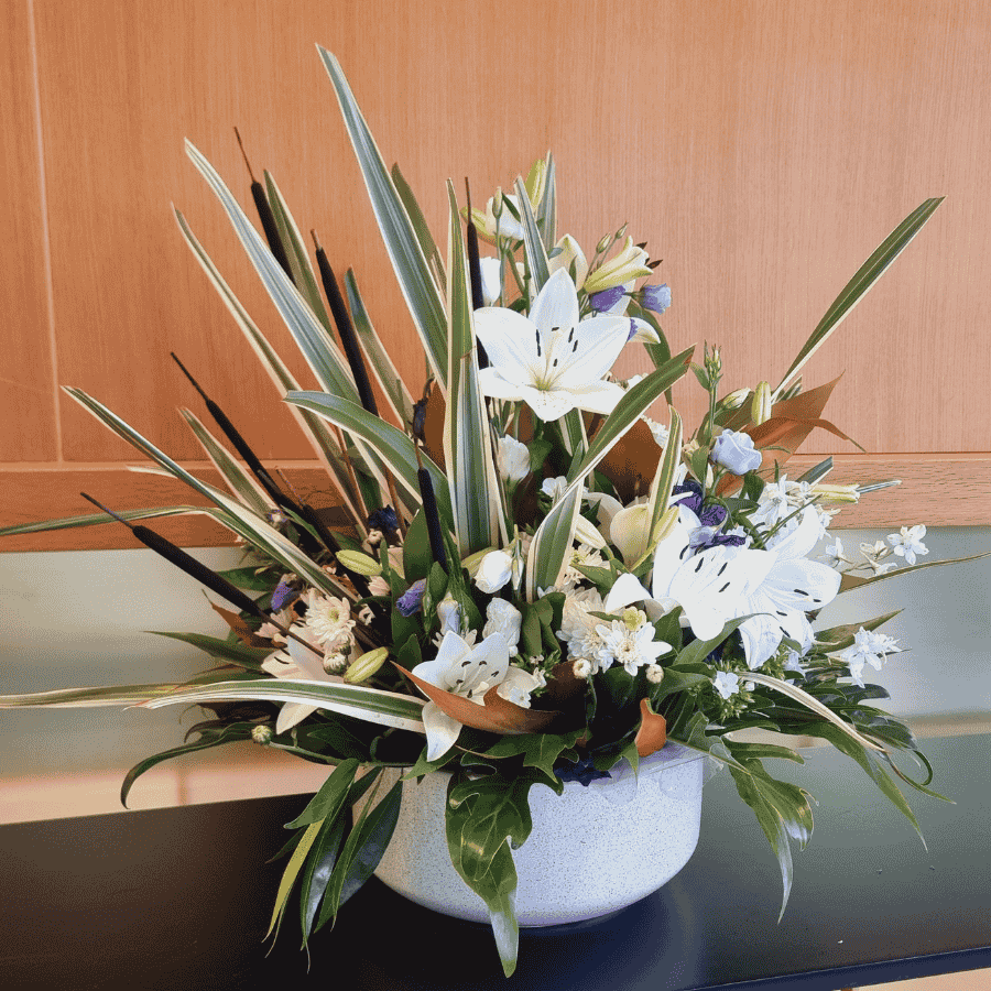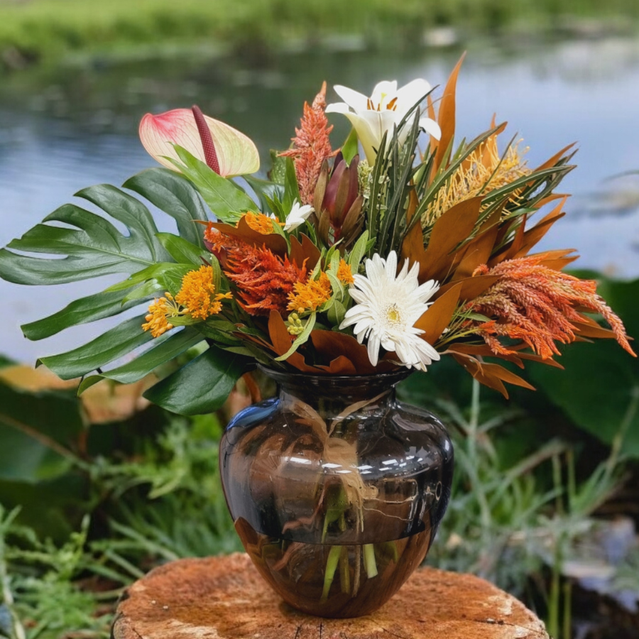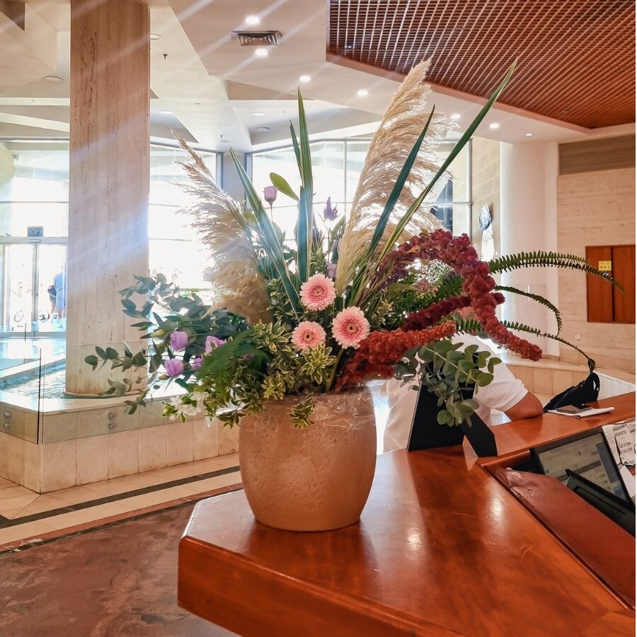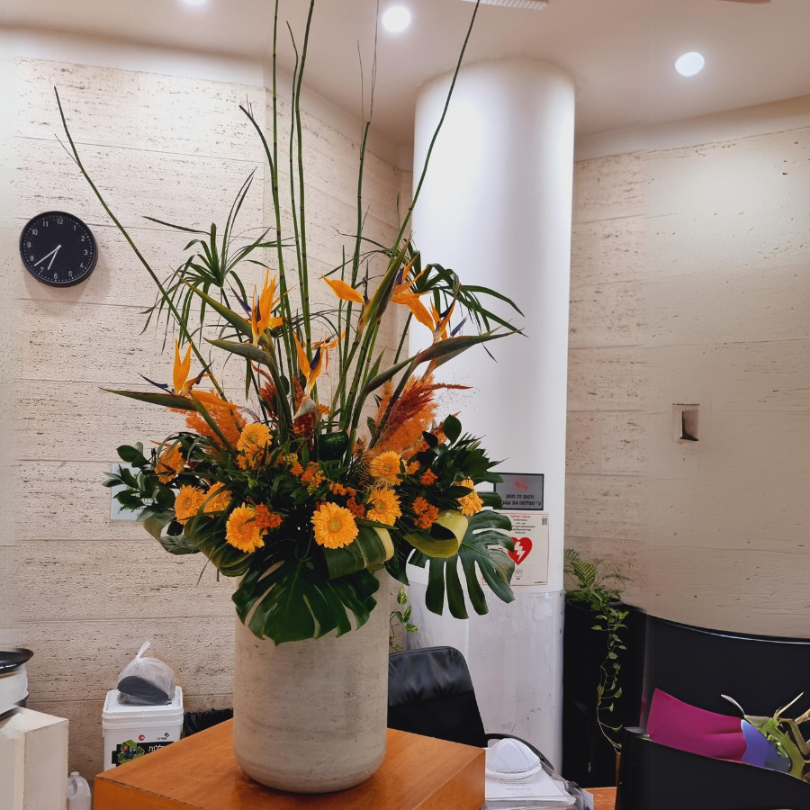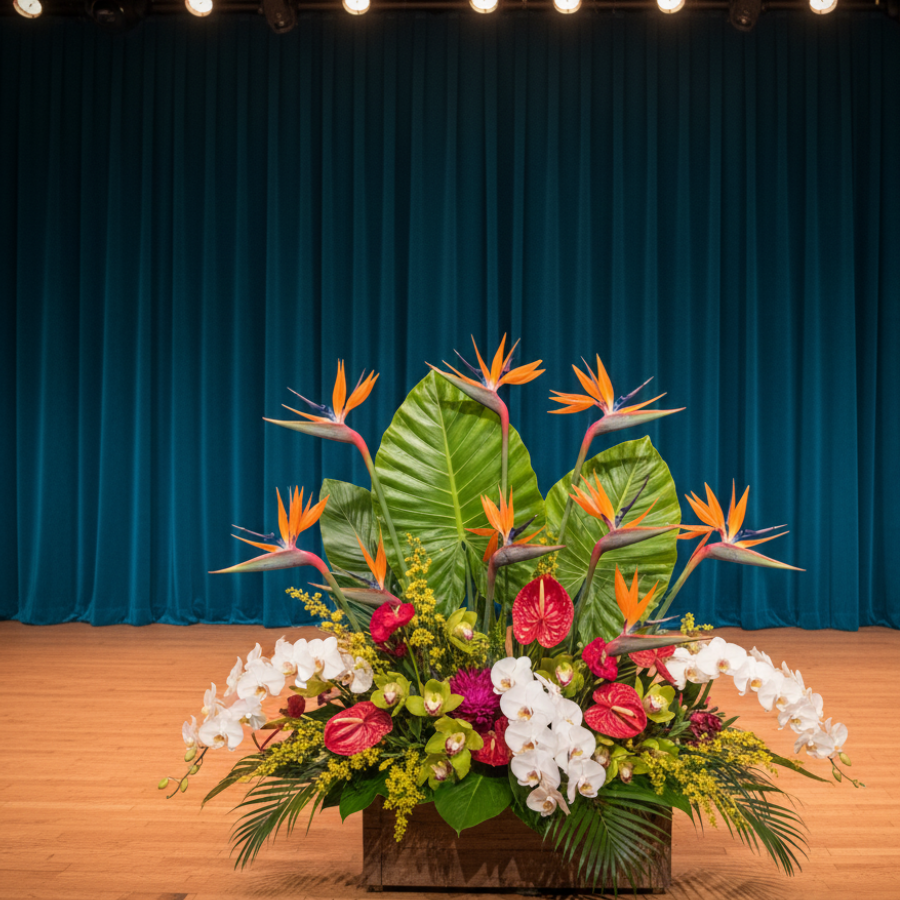 סידור במה אקזוטי עם סחלבים, ציפור גן עדן ועלי כף אריה, המעניקים תחושה טרופית ומרשימה.