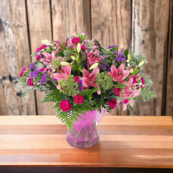 ליליות ורודות + ציפורן + עדעד סגול + טרכליום + ירקים + אלמנטים נוי לגובה