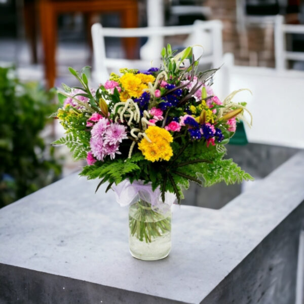 הזר מכיל ליליות כתומות, חרציות בצהוב ובורוד, ליזאנטוס או ציפורן בורוד , אסתר או ליזאנטוס בסגול , סולידגו , כיסופית ומגוון ירקים.