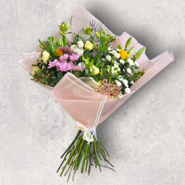 זר פרחים צבעוני ועדין הכולל את פרחי העונה,