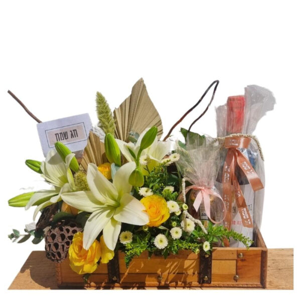 המארז כולל את פרחי העונה, קישוטים יבשים, צנצנת דבש ובקבוק יין אדום איכותי מבית “דרך ארץ”