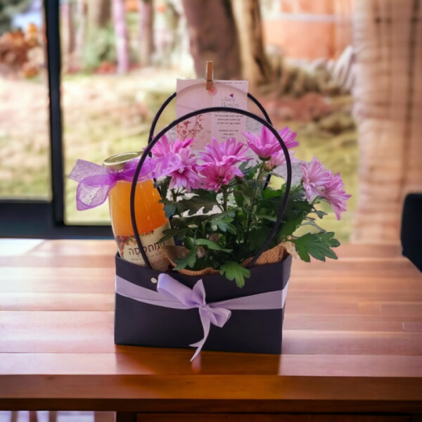 עציץ חרצית בתוך מארז מעוצה המותאם להשקייה – כולל נגיעות של בריאות, מיץ תפוחים 500 מל
