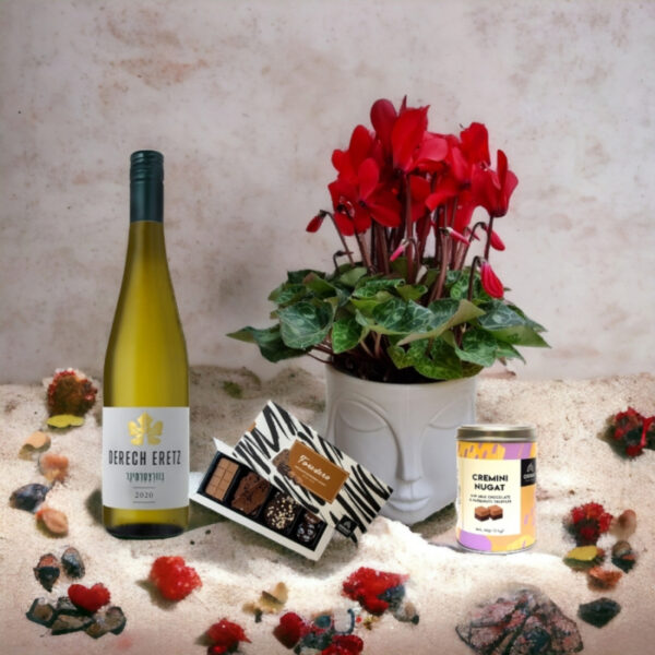 מארז יין, שוקולד ועציץ רקפת בכלי קרמיקה לילך.