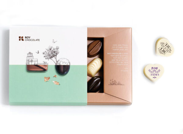מארז 6 פרלינים מושלם לראש השנה 3 פרלינים משוקולד לבן עם הדפסי ברכות לראש השנה, במילוי גנאש חלווה מענג ו- 3 פרלינים נוספים במילויים קלאסיים