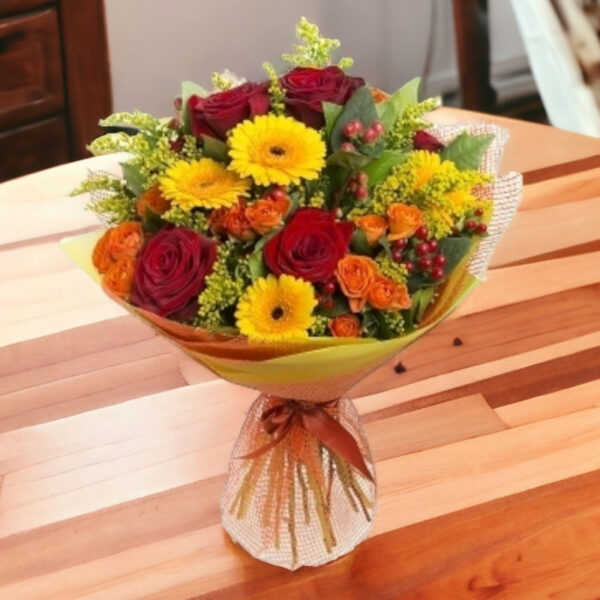 זר צעיר ותוסס . הזר מורכב מורדים בגוונים אדום וכתום, פרחי גרברה צהובים. פרחי סולידגו צהובים,