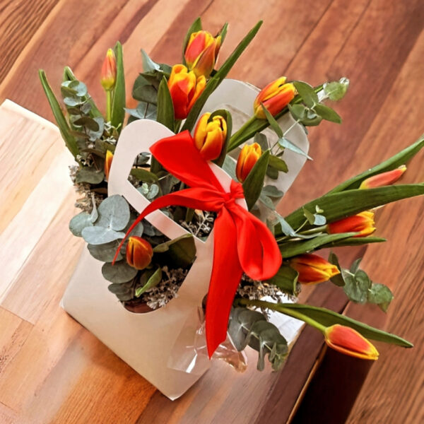 סידור טוליפים לאישה יפה עם בלון לב ומארז שוקו