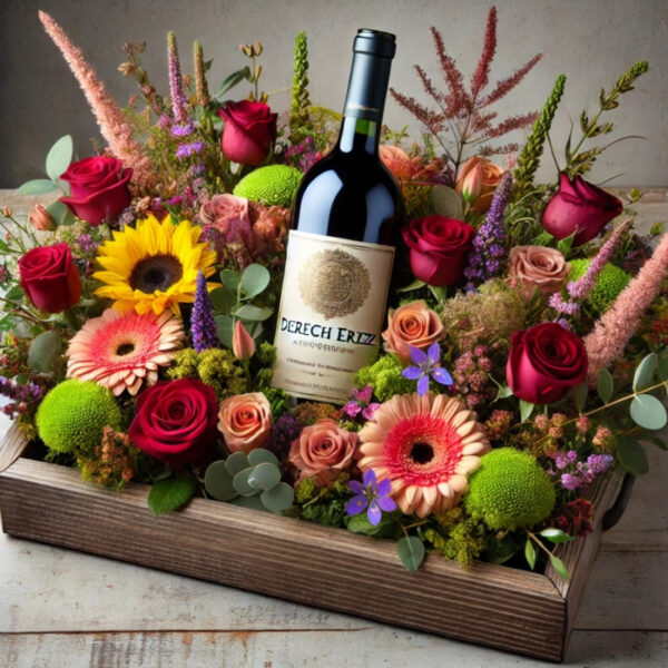 סידור פרחים יוקרתי צבעוני ומרהיב המשלב בקבוק יין אדום יוקרתי במרכזו, מוגש על גבי מגש עץ איכותי. הסידור כולל שילוב עשיר ומלא חיים של פרחים צבעוניים: ורדים אדומים, חמניות, גרברות ורודות, חרציות ססגוניות, ורוניקה, עלי אקליפטוס ועשבי פמפס בגוונים טבעיים, מה שמעניק לסידור תחושת אלגנטיות וחגיגיות. כל פרח נבחר בקפידה ליצירת מראה אמנותי ומרהיב עין, המתאים לכל אירוע חגיגי.