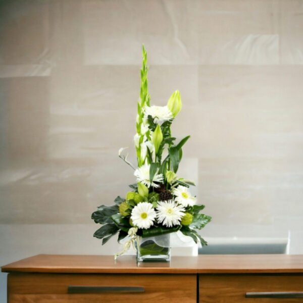 סידור פרחים פריחה לבנה המגיע בכלי זכוכית מרובעת עם פרחי העונה שכוללים סייפנים, שושן צחור, גרברות, כיסופית, ענפי קישוט יבשים, תפוח סדום טרכיליום וענפי ירק בעיצוב ייחודי.