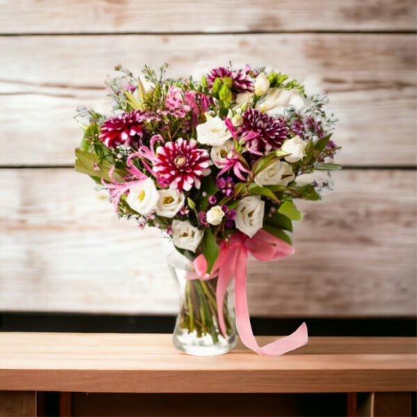 זר חגיגי לאירועים משמחים וליום יום גם. הזר מכיל מגוון חרציות סגולות וורודות , ליזאנטוס בגווני לבן, אלסטרומריה או באלדונה בגווני ורוד ,פרזיות או עדעד בסגול ,סהרון ושרך.