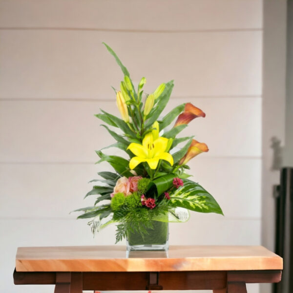 סידור רענן ייחודי ופראי המכיל ליליה בצהוב כלות באדום שעווה אדומה ורדים בצבע פיץ גיפסי ירוק ועלה דיפמבחיה ארוגים באגרטל מרובע או ארובה. שי נהדר לכל אירוע משמח